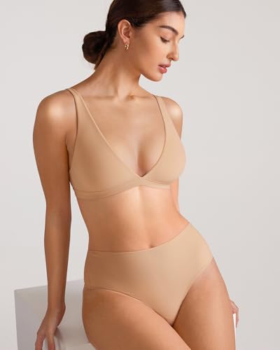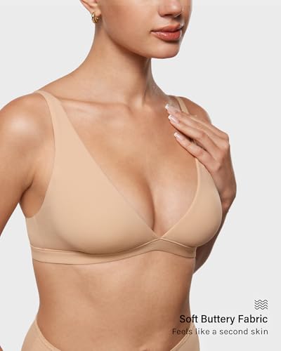 INLYRIC Women's Inbarely Soft Plunge Bralette Unlined Seamless Wireless Triangle Deep V Non Wired Comfort Sleep Bra Warm Beige S