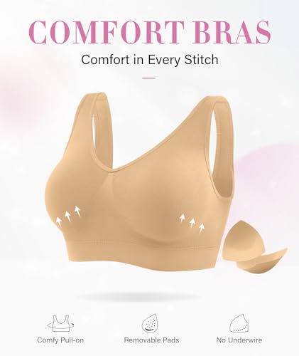 - WIRELESS BRAS , NO BUCKLE – Seamless With wide Straps so it will be your perfect solution for a sleep in Bra or just Everyday Bra. The comfort bra always retains its shape and caresses your figure to adjust to your curves.It Prevents Bra Bulges , back rolls & underarm Cleavage , No Hooks – which means no more trouble Binding & The Ribbed Bottom Band For extra Support .It is also perfect for after surgery or during and after pregnancy